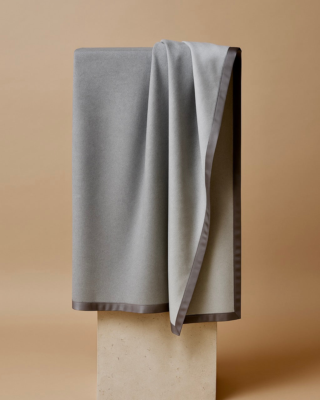 Plaid in cashmere double, impreziosito da un profilo in pelle pregiata che ne definisce i contorni con eleganza decisa. L’incontro tra morbidezza e rigore materico crea un contrasto raffinato, adatto sia a interni moderni che classici. Un accessorio che unisce lusso e sobrietà, ideale per chi cerca dettagli distintivi nei rituali quotidiani.