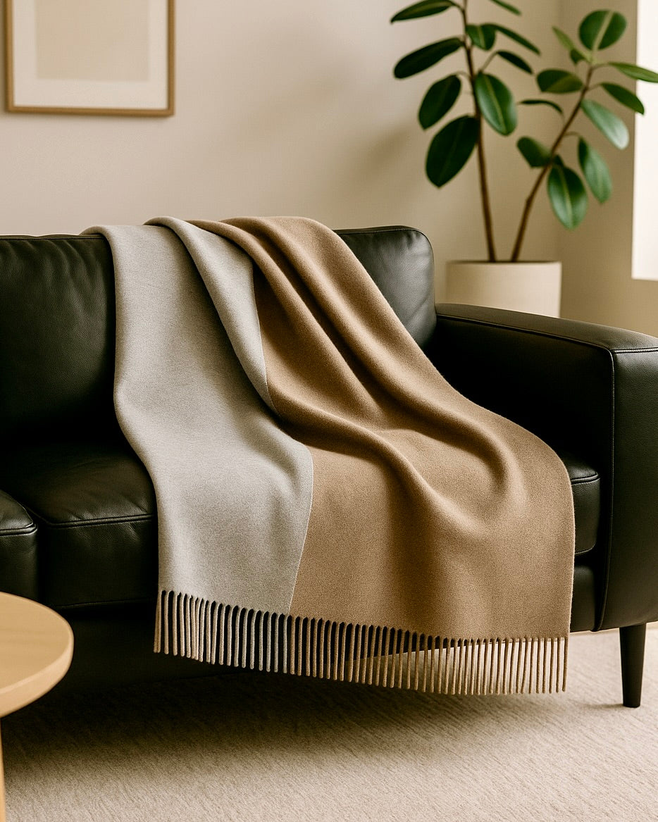 Realizzato in 100% cashmere finissimo, questo plaid double abbina due tonalità armoniose in un dialogo pulito e moderno. Il contrasto delicato dona profondità a qualsiasi ambiente, mentre le morbide frange conferiscono movimento ed eleganza discreta. Perfetto sia per interni raffinati che per i rituali quotidiani.