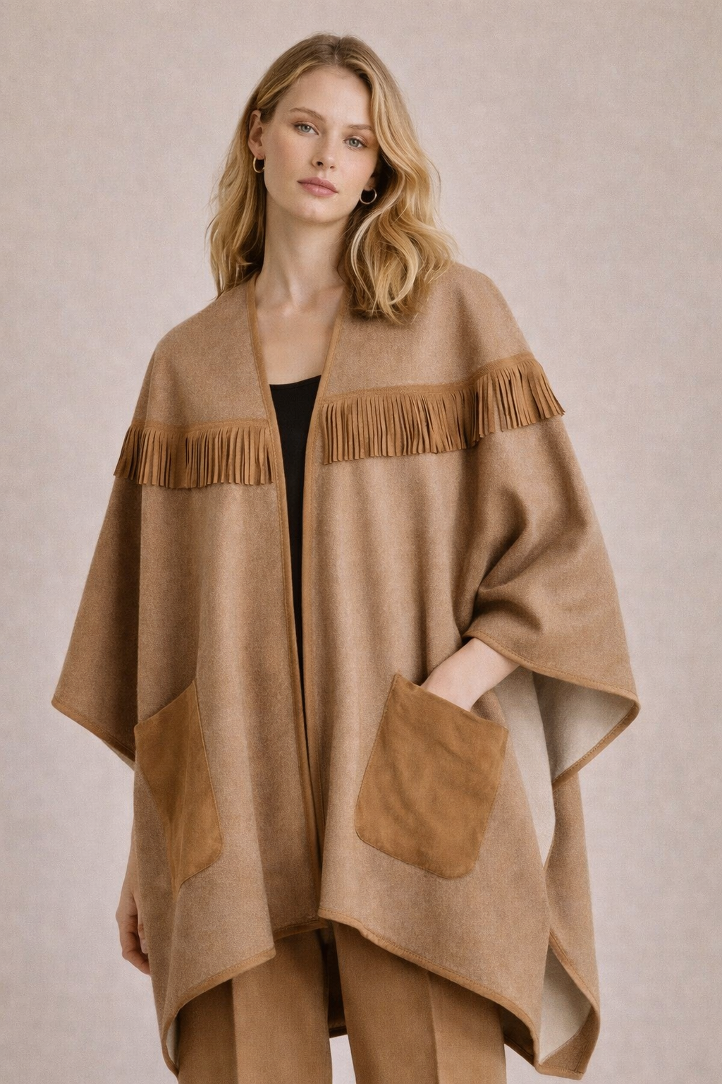 Mantella in cashmere double con inserti in camoscio, frange e tasche applicate.