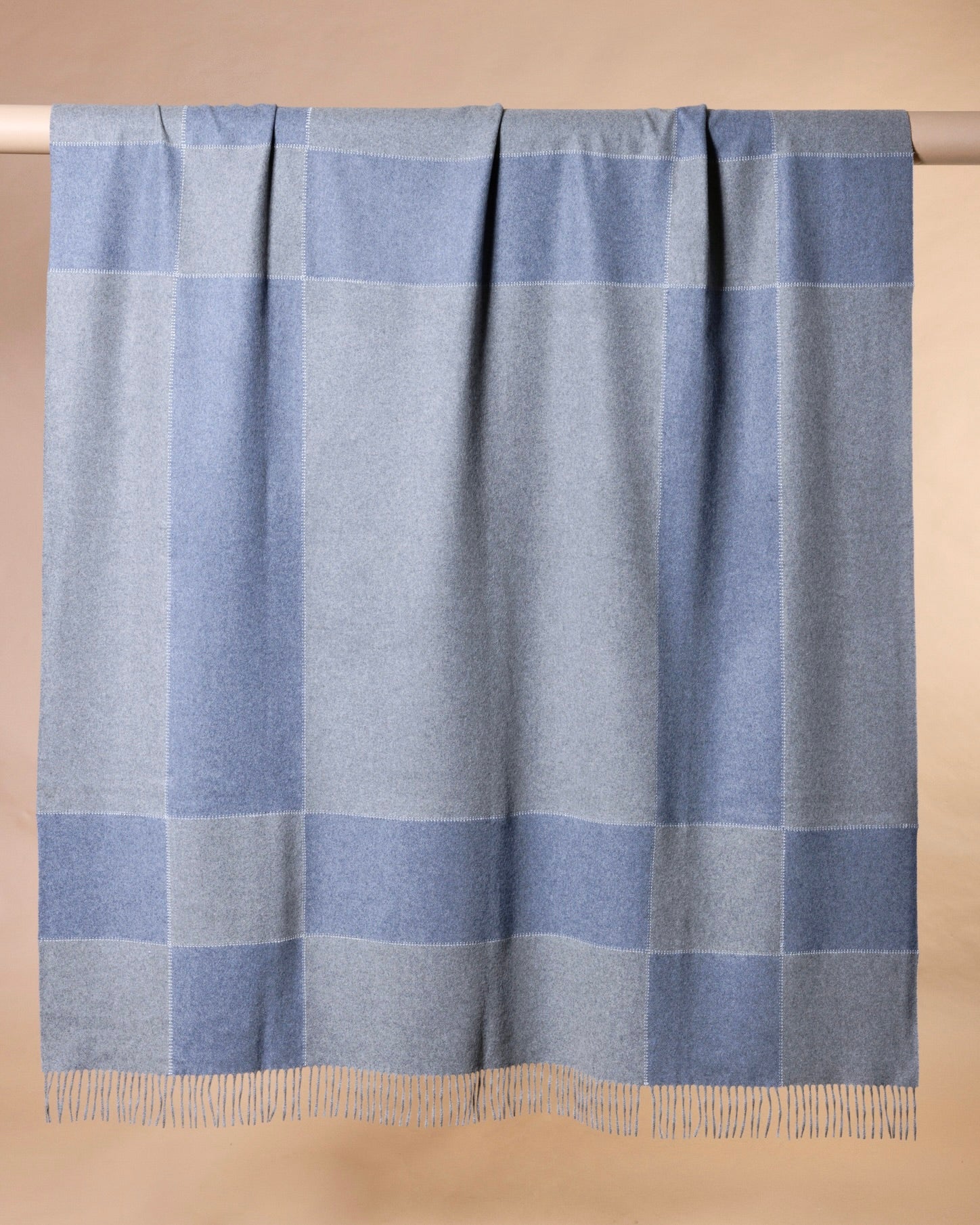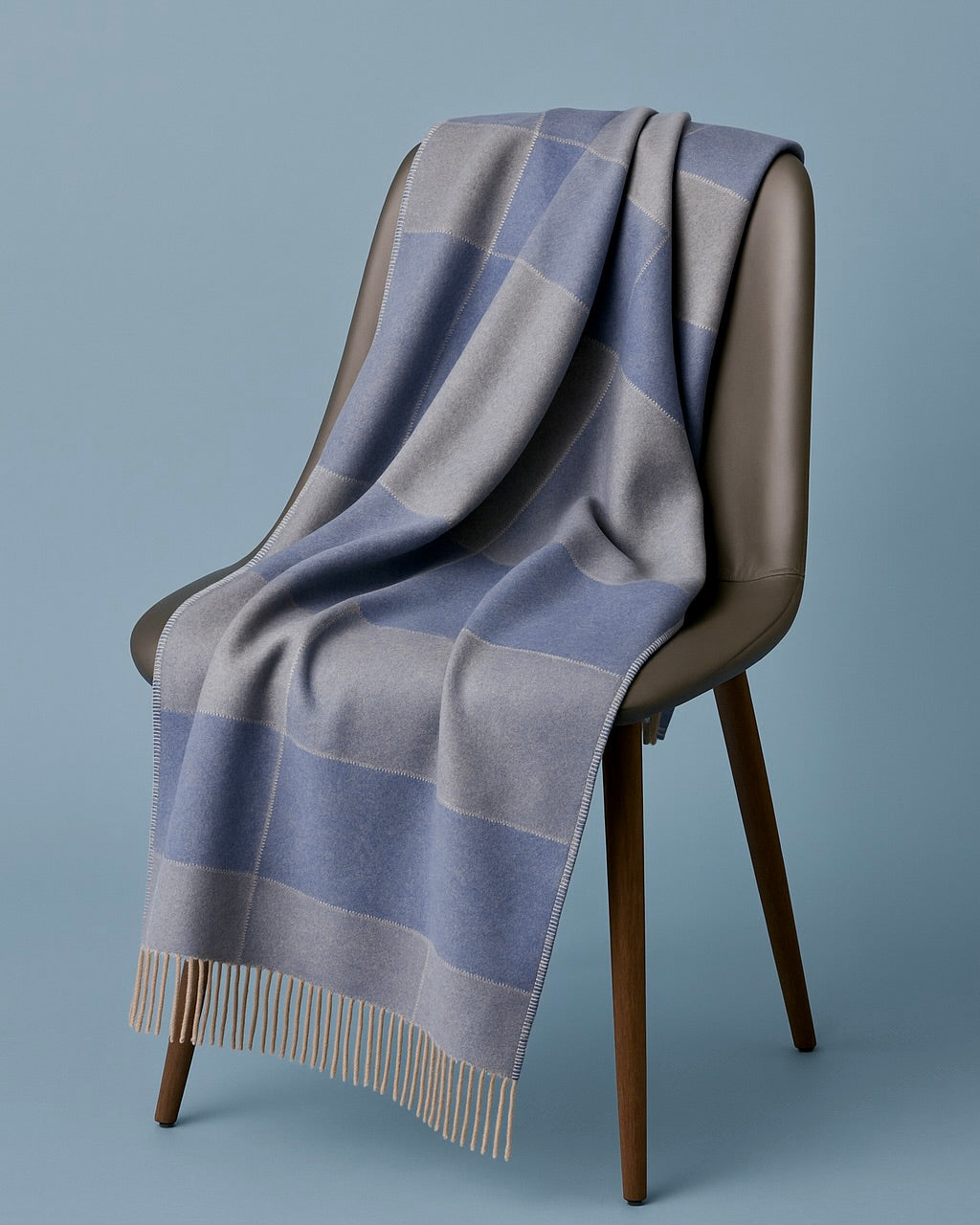 Plaid in puro cashmere, rifinito con l’elegante punto croisette. Il patchwork a cornice esalta la maestria artigianale, creando una geometria armoniosa e sofisticata. Le frange sottili aggiungono movimento e un’eleganza discreta e senza tempo.